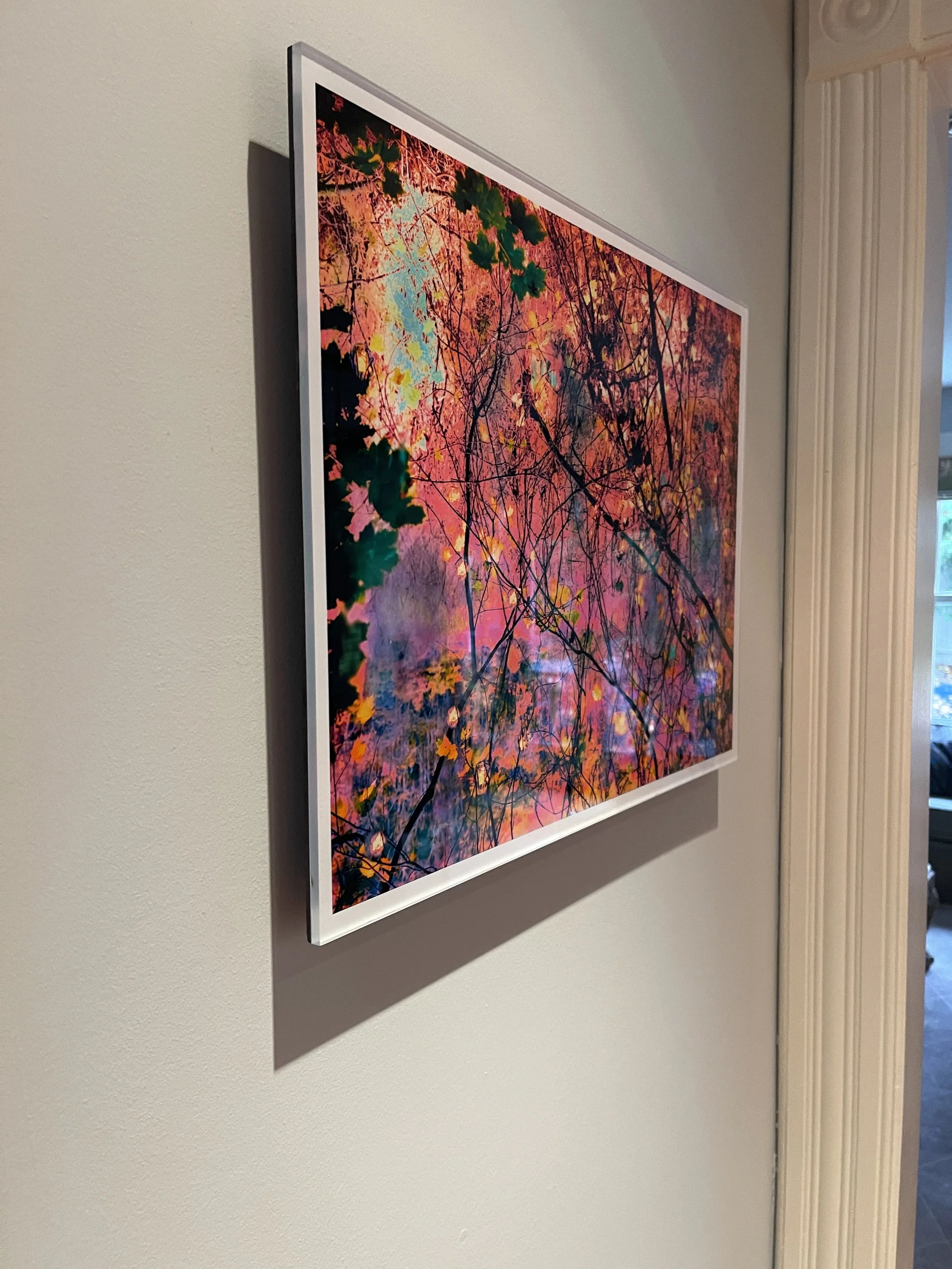 Metallic paper sandwiched between 1/4 inch acrylic, float mount